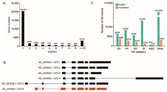 High-throughput transcriptome sequencing technology has been widely used to obtain transcript sequences and to analyze gene expression differences [20,21]. However, the second-generation sequencing technology requires the assembly of short reads (100–150 bp) that lead to low accuracy in the subsequent gene structure analysis, such as alternative splicing and gene fusion, because of the incomplete and inaccurate assembly process. In addition, the sequences of complex regions, such as highly repetitive and high GC content sequences, cannot be assembled. A third-generation sequencing platform can obtain high-quality full-length transcripts directly without PCR amplification and assembly during the sequencing and data analysis. Based on these full-length transcripts, we can precisely identify AS events, APA sites and fusion genes from the transcriptome of an organism.