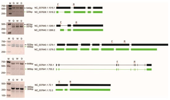 Verification of the alternative splicing events in five genes by RT-PCR and Sanger sequencing. The exon/intron structure of each isoform of each gene is shown in the right panel. The filled boxes represent exons and the lines represent introns. Different isoforms of each gene are displayed in green or black. The locations of the PCR primers are shown with red arrows on the first isoform of each gene. M: marker, Q: queen, W: worker, D: drone.