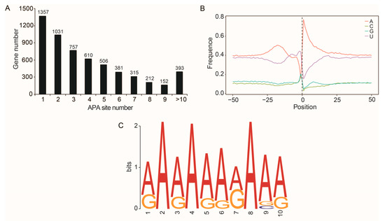 In the queen, worker and drone datasets, 14,491, 14,021 and 15,213 APA loci from 5364, 5262 and 5650 gene loci were identified, respectively (Figure S4). Based on the 116,535 PacBio transcripts, a total of 23,376 APA events at 5714 gene loci were identified, of which 5321 (93.12%) genes had 1–9 poly (A) sites and 393 (6.88%) genes had more than 10 poly (A) sites, with an average of 4.09 poly (A) sites per gene (Figure 5A). The nucleic acid composition 50 bp upstream and downstream of the poly (A) sites were enriched with uracil (U) and adenine (A) (Figure 5B), and a conserved element (AAAAAAAAAA) was over-presented in this region (Figure 5C).