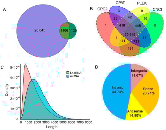 LncRNAs identified from the PacBio honey bee transcriptome. (A) Comparison of the lncRNAs identified in this study with those from genome annotation. (B) The Venn diagram of the number of lncRNAs predicted by CPC2, CPAT, PLEK and CNCI. (C) The length density distribution of lncRNAs and mRNAs. (D) Proportions of the four kinds of lncRNAs.