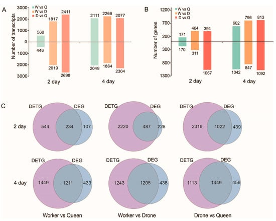 The DETs and DEGs between castes at larvae stage. The DETs (A) and DEGs (B) among queen, worker and drone at 2-day and 4-day larvae stages. (C) The overlapped genes between DETGs and DEGs.
