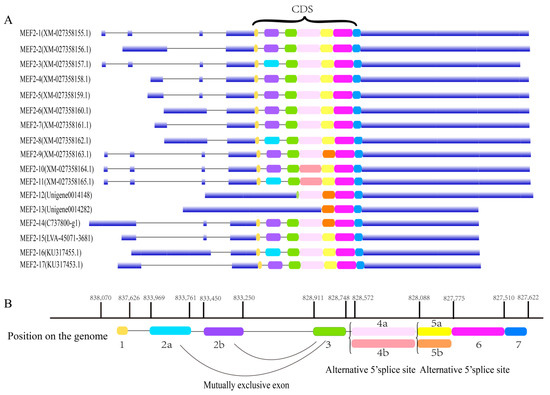 Alternative splicing of the MEF2 gene in L. vannamei. (A) The gene structures of 17 splice variants of LvMEF2. Different colors in the CDS region represent different exons, and the blue blocks which outside the CDS region are the 5′UTR and 3′UTR of the genes, respectively. (B) Different CDS combinations of transcripts of LvMEF2. Two forms of alternative splice variants, a mutually exclusive exon and an alternative 5′ splice site, exist in the CDS region of LvMEF2. Mutually exclusive exons are two exons that cannot be present in one transcript at the same time, as 2a and 2b. Alternative
