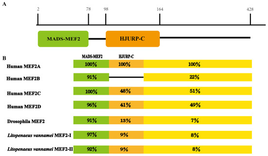 Deduced LvMEF2 domain composition and comparison with Drosophila and human. (A) Functional domain composition of MEF2 in L. vannamei. The black horizontal lines refer to the positions of amino acids that are not part of the functional domain. (B) Predicted MEF2 proteins of L. vannamei were compared with Drosophila and human. Numbers represent the similarity of the domains; human MEF2A is used as a molecular model in the (B), and the black horizontal line shows that MEF2B has no HTURP-C domain. The green blocks refer to MADS-MEF2 domain, the orange blocks refer to HTURP-C domain, the yellow blocks refer to the C-terminus.