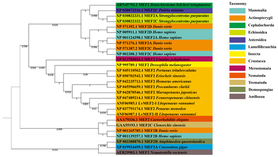 To understand the phylogeny of the MEF2 gene in L. vannamei and other species, a total of 26 MEF2 amino acid sequences (Supplementary Data S2) from representative organisms in different taxa were downloaded from NCBI (https://www.ncbi.nlm.nih.gov/, accessed on 15 October 2022). The sequence IDs used in the phylogenetic analysis are shown in Table 2, with 20 sequences from invertebrates and 9 sequences from vertebrates. The MEGA 11 platform was used for the construction of phylogenetic trees, and the MEF2 sequences of different species were aligned using the Cluster W algorithm under the default model. The phylogenetic tree was constructed based on the neighbor-joining (NJ) method using the default values for all parameters. Finally, the phylogenetic tree was visualized and ornamented through the I-TOL tree online website (https://itol.embl.de/, accessed on 22 October 2022 ).