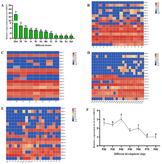 3.2. LvMEF2 Has Complex Expression Profiles