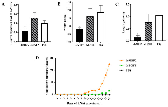The effects of LvMEF2 RNA interference on L. vannamei. (A) Relative expression level of LvMEF2 in muscle after half a month of interference. dsEGFP(Enhanced Green Fluorescent Protein) and PBS were used as controls. The expression of target genes was detected by qRT-PCR, and 18S rRNA gene was simultaneously amplified as the internal reference. (B) Changes in shrimp body weight after half a month of RNA interference. (C) Changes in body length after half a month of RNA interference. These results were based on three independent biological replications and shown as mean values ± SD. Significant differences in the gene expression levels between three treatments are shown as * p < 0.05. (D) Cumulative number of deaths during the LvMEF2 gene interference.
