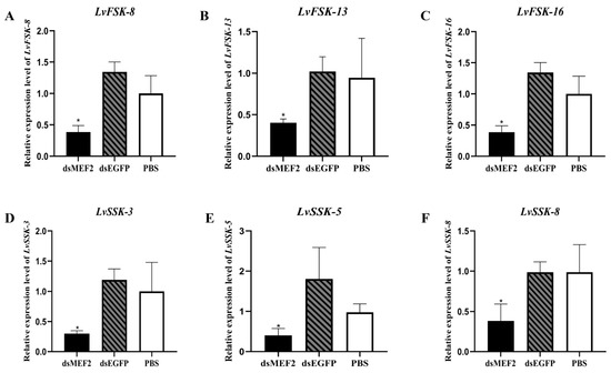 The expression of fast- and slow-type muscle genes after LvMEF2 RNA interference. (A–C) are fast-type skeletal muscle actin (FSK), LvFSK-8, LvFSK-13, and LvFSK-16. (D–F) was slow-type skeletal muscle actin (SSK), LvSSK-3, LvSSK-5, and LvSSK-8. Significant differences in the gene expression levels between three treatments are shown as * p < 0.05.