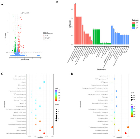 Differentially expressed genes after LvMEF2 knockdown and their functional enrichment analysis. (A) Volcano plot displays DEGs between the dsMEF2 group and the EGFP control group. Blue dots indicate non-significant differential expressions, red dots indicate significantly up-regulated expressions, and green dots indicate significantly down-regulated expressions. (B) GO term distribution for the DEGs. The horizontal axis is the GO term, and the vertical axis is the significance level of GO term enrichment, which is represented by −log10(padj). Padj is the p-value after multiple hypothesis testing corrections; the higher the value, the more significant it is. Different colors represent the three GO subcategories: BP (biological process), CC (cellular component), and MF (molecular function). (C) The top 20 KEGG pathways enriched in muscle for up-regulated DEGs. The abscissa is the ratio of the number of differential genes annotated to the KEGG pathway to the total number of differential genes, and the ordinate is the KEGG pathway. (D) The top 20 KEGG pathways enriched in muscle for down-regulated DEGs.