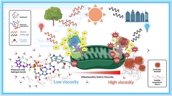 Visible 670 nm red light reduces viscosity in mitochondria interfacial water to increase free water molecules and enhance ATP synthase ability to generate more adenosine triphosphate (ATP). Reactive oxygen species (ROS) increase viscosity and lower ATP synthase efficiency to inhibit ATP production. Melatonin lowers viscosity by scavenging hydroxyl radical (•OH) and ROS. Increased free water molecules from lower viscosity form stronger hydrogen bonds with melatonin to enhance its intrinsic features that include binding interactions with the adenosine moiety of ATP, inhibiting water removal from protein hydration shells that facilitate amyloid fibril aggregation and solubilizing aggregates formed as the result of aberrant phase separation.