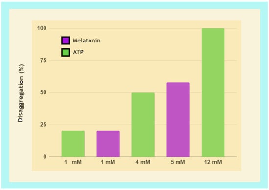 Arguably, the absence of ATP, despite the ability of melatonin to disrupt salt bridge formation, may be the reason why in vitro works on melatonin and tau fibril aggregation reported distinctly different results in the inhibition of fibril formation that could not confirm in vivo and ex vivo observations even at high concentrations of 5000 µM (Table 2).