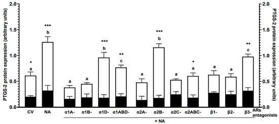 Effects of noradrenaline (NA, 10−5) alone or antagonists of α1-, α2- and β-ARs (10−4 M) with noradrenaline on the PTGS-2 protein expression in the pig endometrium of the CON (black bars) and E. coli (white bars) groups, estimated by the western blot method. Treatments were performed in triplicate for each of the five gilts in the individual groups. Values for PTGS-2 were normalized to GAPDH. The results are expressed as the mean ± sem. Blots with representative bands for each group are presented in Supplementary Figure S1. Different letters (a–c) indicate statistical differences (p < 0.05–0.001) within each group for each subtype of α1- or α2-AR antagonists with noradrenaline or class of β-AR antagonists with noradrenaline and in relation to the control value (CV, untreated tissue) and noradrenaline action alone; *, **, *** indicate statistical differences (p < 0.05–0.001) between groups for the same treatment.