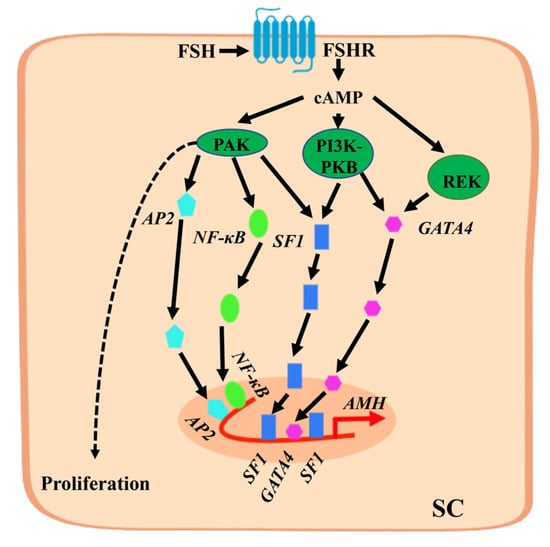 During later stages of embryonic development and after birth, AMH is produced by testicular SCs and can be further induced by FSH [20]. FSH stimulates SCs to secrete AMH through two different mechanisms: (1) FSH induces SCs to proliferate, increasing the number of cells to increase the level of AMH secretion; (2) FSH up-regulates the expression level of the AMH gene in SCs [20,21]. A study found that FSH in SCs sends signals through the cyclic adenosine monophosphate (cAMP) and protein kinase A (PKA) pathways to induce an increase in AMH gene expression. Although the AMH gene promoter lacks a classical cAMP response element, some transcription factor sites exist in the AMH gene promoter that respond to cAMP and regulate the expression of the AMH gene [22]. The specific regulatory mechanism is shown in Figure 1, where FSH binding to the FSH receptor (FSHR) induces an increase in cAMP levels, activating several protein kinases. The main kinase responsible for up-regulating AMH gene transcription is PKA, which induces the translocation of SOX9, SF1, GATA4, adaptor protein 2 (AP2), and nuclear factor kappa-B (NF-κB) transcription factors into the nucleus and binds to the promoter region to jointly promote the expression of the AMH gene. In addition, cAMP promotes the proliferation of SCs and increases the number of cells required to produce AMH. Therefore, AMH is regarded as a biomarker of FSH in the testes before puberty.