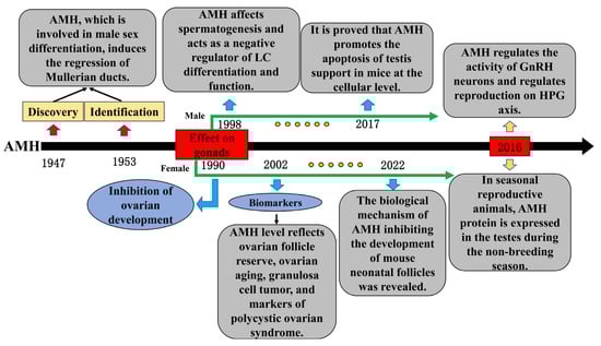 As early as the 1940s, researchers found that a testicular factor other than testosterone induced the regression of the Müllerian ducts during the development of male embryos and was later identified as AMH, which plays a critical role in the sex differentiation of fetuses [11,38]. Since then, numerous physiological functions of AMH have continuously been determined. According to research, AMH secretion disorder is the main biomarker of gonadal dysplasia, such as delayed puberty, premature puberty, and AIS [39]. These symptoms indicate that AMH may affect the growth and development of gonadal tissues. In females, the AMH level reflects the ovarian follicle reserve and serves as a biomarker for infertility treatment, ovarian aging, granulosa cell tumors, and polycystic ovary syndrome [40,41]. A previous study has shown that AMH inhibits the development of mouse ovaries during the embryonic period [42]. Recently, Meisohn et al. treated newborn mice with AMH and applied single-cell sequencing (scRNA-seq) methods to the ovary on the sixth day, thereby revealing the specific mechanism by which AMH inhibits the early growth and development of ovaries [43]. In males, early studies have shown that AMH affects spermatogenesis and negatively regulates the differentiation and function of testicular LCs [44,45]. Recently, Rehman et al. studied the effect of AMH on the proliferation of mouse testes’ SCs at the cellular level and found that a high concentration of AMH induced the expression of apoptosis genes and an increase in the apoptosis rate [46], which showed that AMH can affect reproduction at the testicular tissue level. In addition, AMH may play a regulatory role in the HPG axis during reproduction. Polycystic ovarian syndrome (PCOS) is a common symptom of female infertility [47]. The main sign is that the ratio of LH to FSH in the serum is higher than normal; at the same time, the level of circulating AMH hormone is higher in patients with PCOS [48], indicating that the AMH secretion disorder is a potential cause of the imbalance in the LH and FSH ratio. Cimino et al. found that AMH could stimulate the activity of GnRH neurons in the hypothalamus, resulting in an increase in the level of LH secretion in the pituitary gland, providing a scientific reference for the treatment of PCOS [49]. These existing studies have shown a broader physiological function of AMH in the field of reproduction, providing a scientific basis for studying the AMH regulatory role in seasonal reproduction (Figure 3).
