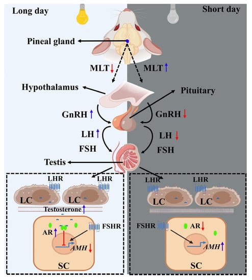 Potential relationship between anti-Müllerian hormone (AMH) and the seasonal reproduction pathway. For long-day breeders, the eyes sense the long day and send signals to reduce the secretion of MLT in the pineal gland during the breeding season. The low-level MLT indirectly promotes the activity of gonadotropin-releasing hormone (GnRH) neurons in the hypothalamus. The secreted GnRH stimulates the synthesis and secretion of luteinizing hormone (LH) and follicle-stimulating hormone (FSH) in the pituitary. LH acts on the Leydig cells (LCs) to promote the production of androgen, and the androgen enters the Sertoli cells (SCs) to inhibit the expression of the AMH gene by binding to the androgen receptor (AR), with the inhibition effect being greater than the promotion effect of FSH. In contrast, when the long-day breeder is in the non-breeding season (short day), the secretion of MLT in the pineal gland increases, which indirectly causes a decrease in the reduction in the activity of GnRH neurons in the hypothalamus and the synthesis and secretion of LH in the pituitary gland. This decreases the synthesis of androgen regulated by LH in the LCs, resulting in the weakening or disappearance of the inhibition of androgen on the expression of the AMH gene. However, the promotion of FSH continues and the AMH gene expression increases. The blue arrow indicates an increase in hormone secretion, while the red arrow indicates a decrease in hormone levels.