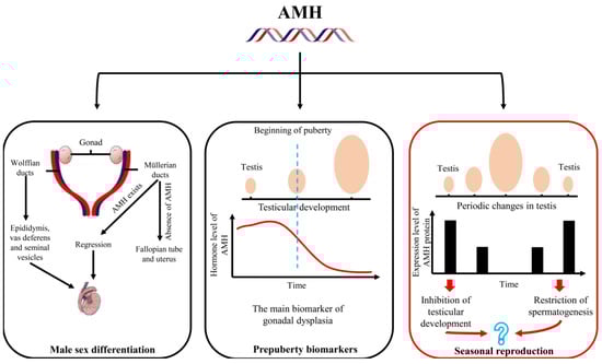 Seasonal reproduction is a survival strategy by which animals adapt to environmental changes to improve their fitness. Males are often characterized by a significantly reduced testicular volume, indicating that they are in an immature state. Although many hormones, including gonadotropins, have played a role in testicular development and spermatogenesis, research on other hormones is insufficient. The anti-Müllerian hormone (AMH), which is a hormone responsible for inducing the regression of Müllerian ducts involved in male sex differentiation, was discovered in 1953. Disorders in AMH secretion are the main biomarkers of gonadal dysplasia, indicating that it may play a crucial role in reproduction regulation. A recent study has found that the AMH protein is expressed at a high level during the non-breeding period of seasonal reproduction in animals, implying that it may play a role in restricting breeding activities. In this review, we summarize the research progress on the AMH gene expression, regulatory factors of the gene’s expression, and its role in reproductive regulation. Using males as an example, we combined testicular regression and the regulatory pathway of seasonal reproduction and attempted to identify the potential relationship between AMH and seasonal reproduction, to broaden the physiological function of AMH in reproductive suppression, and to provide new ideas for understanding the regulatory pathway of seasonal reproduction.