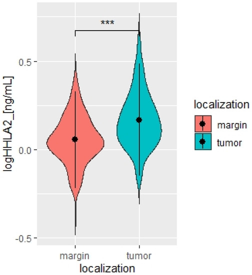 HHLA2 is a novel immune checkpoint molecule belonging to the B7 family of ligands and is widely expressed in cancer samples and participates in the growth and development of various cancers [13,17]. Our study found a significantly higher level of HHLA2 protein in tumors compared to healthy tissue, and 97% of tumors stained positive for HHLA2. Table 2 presents the division of the examined tumors into HHLA2-positive and HHLA2-negative tumors.
