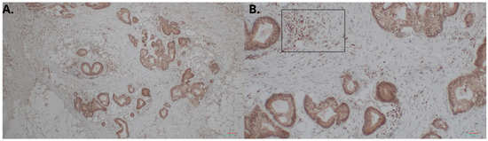 HHLA2 immunostaining in CRC specimens. Intense staining of the glands and accompanying infiltration of lymphocytes: (A) 100× magnification; (B) 400× magnification. In (B), HHLA2-positive lymphocytes are marked in the frame.