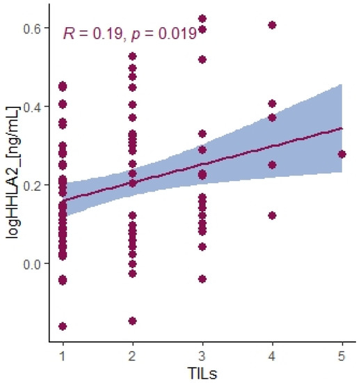 Correlation between HHLA2 concentrations in tumor tissue homogenates and TILs score. Tau Kendall correlation coefficient.
