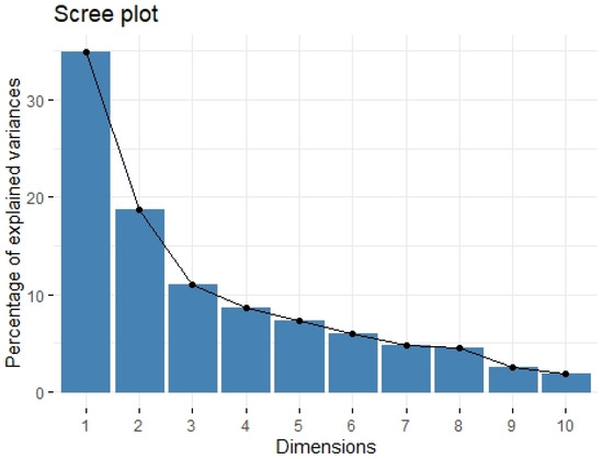 Scree plot of principal component analysis containing protumor growth factors (HGF, M-CSF, b-NGF, SCGF-b, IL-7, FGFbasic, G-CSF, PDGF-bb, VEGF, GM-CSF). Scree plot shows the proportion of overall variance explained by each individual principal component (factor).
