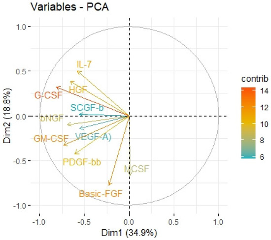 Principal components of protumor growth factors representing variance in two dimensions. PCA loading plot showing PCA of the protumor trophic factors and correlation circle is demonstrated around the PCA. X-axis (Dim1/factor1) is orthogal to y-axis (Dim 2/factor 2). The color and length of vector indicate how strongly each cytokine contributes to principal components/factors (Dim 1 and Dim 2) and how original concentrations of cytokines are associated with their coordinate values.