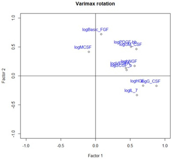 Loading plot presenting loading factors after varimax rotation to change positioning vector of the factors and provide easier interpretation of factor loadings.