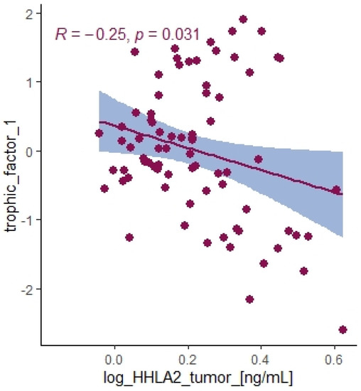 Correlation between HHLA2 tumor concentration and trophic factor1 from principal component analysis containing HGF, M-CSF, b-NGF, SCGF-b, IL-7, FGFbasic, G-CSF, PDGF-bb, VEGF, GM-CSF.