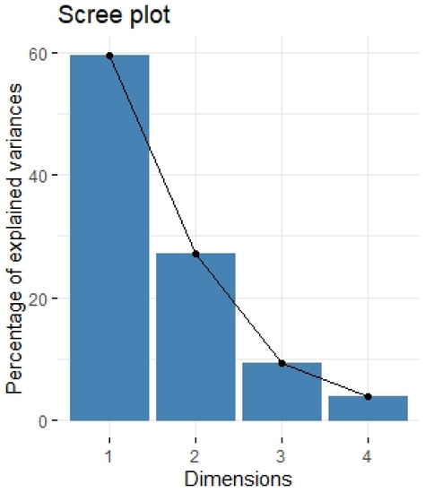 Scree plot of principal component analysis containing antitumor cytokines: IL-1a, IL-12, IL-13, TNF-a. Scree plot shows the proportion of overall variance explained by each individual principal component (factor).