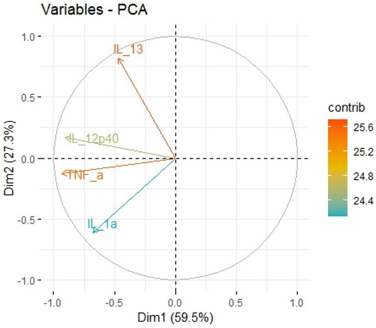 Principal components of antitumor cytokines representing variance in two dimensions. PCA loading plot showing PCA of the antitumor cytokines and correlation circle is demonstrated around the PCA. X-axis (Dim1/factor1) is orthogal to y-axis (Dim 2/factor 2). The color and length of vector indicate how strongly each cytokine contributes to principal components/factors (Dim 1 and Dim 2) and how original concentrations of cytokines are associated with their coordinate values.