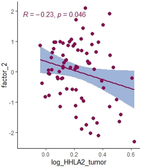 Correlation between HHLA2 tumor concentration factor 2 from principal component analysis containing cytokines IL-1a, IL-12, IL-13, TNF-a.