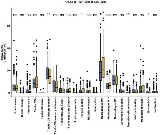 The immunological landscape of CRC related to HHLA2 expression, with analyses based on THE CANCER GENOME ATLAS-COLON ADENOCARCINOMA (TCGA-COAD) dataset. Immune cell infiltration scores calculated by CIBERSORT method by the web-based tool Camoip in high- and low-HHLA2-expression groups; * p < 0.05, ** p < 0.01, and *** p < 0.001; ns = not significant.