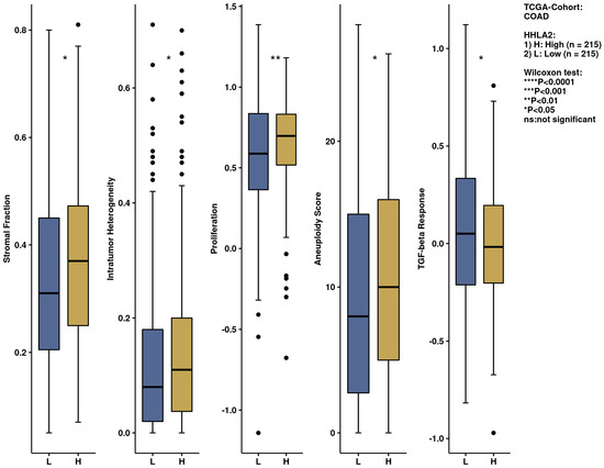 We further performed a comprehensive analysis by the web-based tool Camoip and investigated the immune composition of colorectal cancer in relation to HHLA2 expression. We observed an association between various fractions of immune cells, such as CD4+ T cells, NK cells, macrophages, dendritic cells, and HHLA2, which is in line with other studies [21]. The immune scores for stromal fraction, intratumor heterogeneity, proliferation, and aneuploidy were upregulated significantly in the HHLA2 high-expression group (Figure 12), suggesting an impact of HHLA2 on tumorigenesis [37,38].