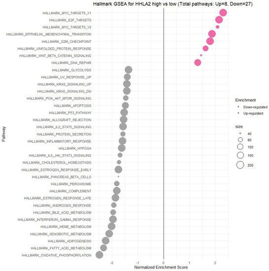 Moreover, GSEA showed that HHLA2 was linked to critical hallmark pathways in colorectal cancer related to cell cycle regulation and apoptosis. There was a relation between a high expression of HHLA2 and upregulation of “HALLMARK_MYC_TARGETS_V1” and the “HALLMARK_MYC_TARGETS_V2”. MYC is one of the most studied oncogenes known to promote cell proliferation. Several studies have reported a significant correlation between high MYC V1 and V2 scores, worse survival, and cancer aggressiveness [29,30,31,32]. Strippoli et al. demonstrated that higher MYC levels are associated significantly with higher and faster resistance to anti-EGFR chemotherapy treatment. They found a significant association between MYC and lower OS, indicating MYC as a possible negative prognosticator [30]. Chen et al. confirmed in their cellular studies that the MYC expression was significantly decreased after the HHLA2 knockdown [27].