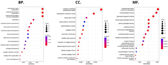 HHLA2-related pathways activated in CRC were analyzed by performing GSEA between low and high HHLA2 expression datasets. Significant differences (p.adjusted < 0.05) in the Molecular Signature Database Collection enrichment for hallmark gene sets are shown in Figure 13. The main upregulated pathways for HHLA2 were the c-MYC target pathway, E2F-target pathway, epithelial–mesenchymal transition EMT, and G2M checkpoint. Conversely, the most critical downregulated pathways related to high expression of HHLA2 were the Kras and PI3K/AKT/MTOR signaling pathways and the apoptosis and inflammatory response pathways. The biological function of HHLA2 was predicted by Gene Ontology (GO). The analysis demonstrated that HHLA2 was significantly associated with extracellular matrix structural constituents, endopeptidase activity, and glycosaminoglycan-binding in the molecular function category (MF) and with collagen-containing extracellular matrix in the cellular components category (CC) and extracellular matrix organization, extracellular structure organization, and external encapsulating structure organization in the biological process category (BP) (Figure 14).