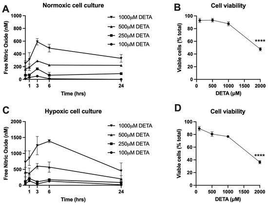 Free nitric oxide (NO) has a half-life of only a few minutes in aqueous buffer equilibrated with room air, and thus, to establish a constant and physiological NO concentration over the 24 h treatment period of the study, the slow-releasing NO-donor DETA was employed. Preliminary experiments were conducted to determine the yield of steady-state NO concentrations produced over a 24 h treatment period from DETA at concentrations of 100, 250, 500, 1000, or 2000 μM. Because the rate of NO consumption is dependent upon O2 concentrations, the dose-response experiment was carried out under both normoxic (21% O2) and hypoxic (2% O2) conditions at 37 °C. As shown in Figure 1A,B, NO concentrations were relatively stable over the 24 h period at all doses of DETA. Cell viability assays (Figure 1C,D) determined 500 μM DETA to be the highest concentration that did not result in a marked decrease in cell viability under both normoxic and hypoxic conditions, and thus, subsequent experiments were carried out with 500 μM DETA, which yielded average steady-state NO concentrations over the 24 h treatment period of 208.9 ± 49.1 nM under normoxia and 432.4 ± 209.8 nM under hypoxic conditions.