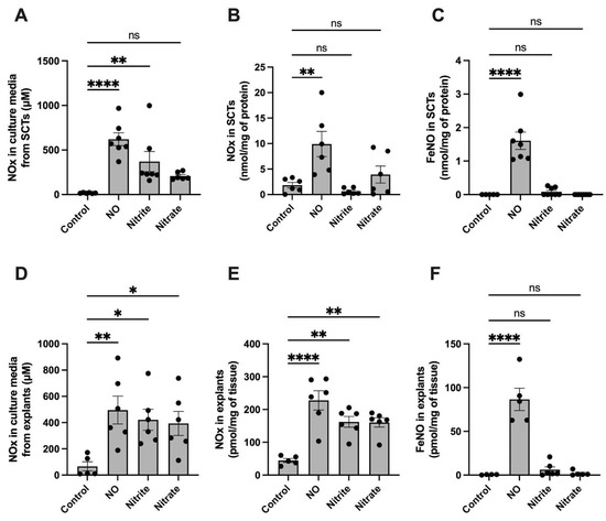 NO metabolites and FeNO formation in cultured BeWo cells and villous explants after 24 h of treatment with NO (as 500 μM DETA), nitrite (250 μM), or nitrate (250 μM). (A) Total NOx (NO, nitrite, nitrite, FeNOs, and SNOs) in normoxic cell culture media of syncytialized BeWo cells (SCTs) following 24 h of treatment with NO, nitrite or nitrate. (B) NOx (NO, nitrite, FeNOs, and SNOs but not nitrate) found in homogenized syncytialized BeWo cells following 24 h treatment with NO, nitrite, or nitrate. (C) FeNO levels found in syncytialized BeWo cells following 24 h treatment with NO, nitrite, or nitrate. (D) Total NOx in culture media of human placental explants following 24 h of treatment with NO, nitrite, or nitrate. (E) TotalNOx found in human placental explants following 24 h treatment with NO, nitrite, or nitrate. (F) FeNO levels found in placental explants following 24 h treatment with NO, nitrite, or nitrate. FeNO formation is significantly increased by the presence of NO but not nitrite or nitrate. Data are reported from at least three independent experiments as mean ± SD, * p < 0.05, ** p < 0.01, **** p < 0.0001, ns = not significant.