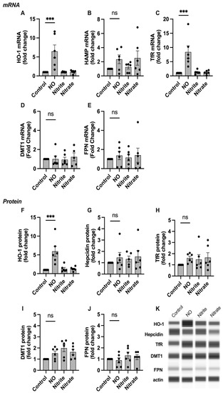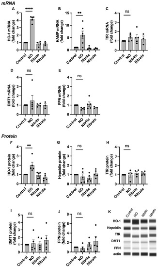 In SCTs, the mRNA expression of HO-1 and HAMP was significantly increased in experimental groups treated with NO (Figure 3). No significant change was seen in the other four genes studied. At the protein level, HO-1 abundance was significantly increased, while hepcidin remained unchanged compared to the control. No change was seen in the other proteins studied, and neither nitrite nor nitrate had any effect on mRNA or protein levels for any of the targets.