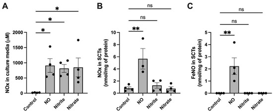 NO metabolism and FeNO formation in BeWo cell culture after 24 h of treatment with NO (as 500 μM DETA), nitrite (250 μM), or nitrate (250 μM) under hypoxic conditions. (A) Total NOx in hypoxia cell culture media of syncytialized BeWo cells (SCTs) following 24 h of treatment. (B) NOx found in SCTs following 24 h treatment with NO, nitrite, or nitrate under hypoxic conditions. (C) FeNO levels found in SCTs following 24 h treatment with NO, nitrite, or nitrate under hypoxic conditions. FeNO formation is significantly increased following exposure to NO but not nitrite or nitrate. Data are reported from at least three independent experiments as mean ± SD, * p < 0.05, ** p < 0.01, ns = not significant.