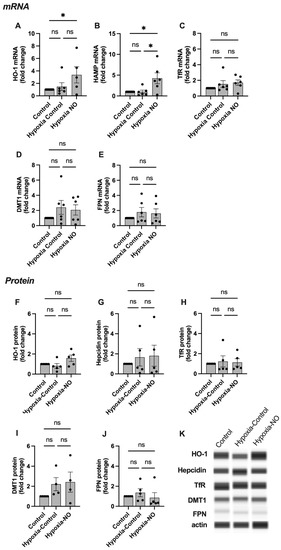 The effect of hypoxia on iron handling genes in response to NO in syncitialized BeWo cells (SCTs). (A–F) qPCR results and (G–K) protein analyses. Representative blots are shown in (K). Hypoxia alone did not significantly alter mRNA or protein levels of any of the studied iron homeostasis markers compared to normoxic controls. (A,B) The combination of hypoxia and NO resulted in a significant increase in HO-1 and HAMP mRNA levels, while NO increased HAMP mRNA levels significantly under hypoxic conditions. No significant effect of hypoxia or NO was seen in any of the other targets studied. HO-1: Heme Oxygenase 1, HAMP: Hepcidin antimicrobial peptide, TfR: Transferrin Receptor, TF: Transferrin, DMT1, Divalent metal transporter 1, FPN: Ferroportin 1. Data are reported from at least three independent experiments as mean ± SD, * p < 0.05, ns = not significant.