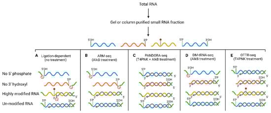 Next-generation sequencing (NGS) has provided an unprecedented opportunity to discover and quantify diverse classes of sRNA (miRNA, endo-siRNA, piRNA, etc.). However, due to various structural and chemical modifications on sRNAs, depending on the RNA-sequencing protocol used, only a subset of sRNAs are captured in most sequencing libraries []. For example, the main steps of a typical sRNA library preparation process include adaptor ligation, reverse transcription, and PCR amplification. All of these steps can introduce bias in the types of sRNA cloned in the sequencing libraries (Figure 1). The ligation-based protocols require 5′ phosphate and 3′ hydroxyl groups for adaptor ligation and are, therefore, most efficient at sequencing miRNAs which naturally have these ends []. However, sRNAs such as tRFs and rsRNAs which are generated by endonuclease cleavage (e.g., cleavage of tRNAs by RNase A and T2 family endonucleases) have a 2′, 3′ cyclic phosphate or a 3′ phosphate, which can hinder the capture of these sRNAs in sequencing libraries []. Moreover, as tRNAs are highly modified RNA molecules, many reverse transcriptase (RT) enzymes cannot read through the hard-stop modifications on tRNAs and fall off prematurely, synthesizing only partial cDNAs []. These partial cDNAs are not amplified during the PCR amplification step as they lack one of the adaptor sequences and remain undetectable in the final sequenced library. All of the above scenarios can drastically influence cDNA synthesis efficacies and exemplify sources of bias in deep sequencing of sRNAs.