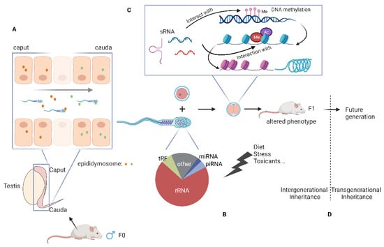 Small RNA sequencing of male germ cells at different stages of development revealed that sperm undergo dynamic changes in their sRNA payload [,]. Spermatogenesis occurs in the testis, following which the testicular spermatozoa enter a long-convoluted tubule known as the epididymis where sperm mature and acquire motility and fertility []. Sperm sRNA payload is dramatically altered during sperm epididymal maturation. While testicular germ cells are highly abundant in piRNAs, the mature epididymal sperm are chiefly comprised of tRFs, miRNAs, and rsRNAs [,].