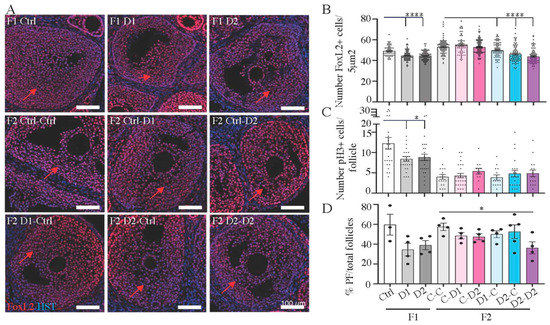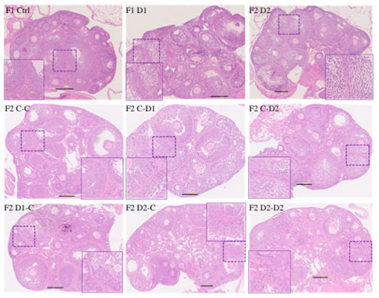 2.5. Histology and Folliculogenesis Onset in 30 dpp F1 and F2 Ovaries