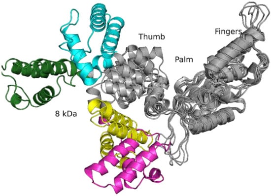 - Sawaya, M.R.; Prasad, R.; Wilson, S.H.; Kraut, J.; Pelletier, H. Crystal Structures of Human DNA Polymerase Beta Complexed with Gapped and Nicked DNA: Evidence for an Induced Fit Mechanism. Biochemistry 1997, 36, 11205–11215. [Google Scholar] [CrossRef] [PubMed]