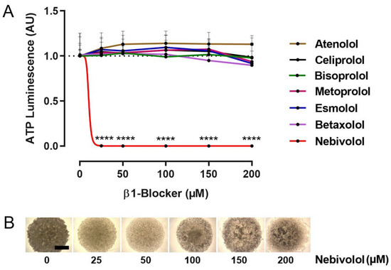 Screening for ß1-selective blockers with anti-tumor activity in 3D tumor spheroids. (A) Concentration-response curves of tumor spheroids generated from a Mel270 cell line. Spheroid viability was determined using an ATP luminescence assay, normalized to the ATP luminescence of the respective control spheroids (0 µM ß1-blocker), and is given in arbitrary units (AU). The means ± SD of at least three independent experiments for each β1-blocker with n = 6–8 spheroids for each concentration shown. Statistical analysis was performed using a one-way ANOVA and Tukey’s multiple comparisons test, and the significance levels of the treated spheroids in relation to the control spheroids (0 µM ß-blocker) are indicated at **** p < 0.0001. (B) Representative microscopic images of Mel270 tumor spheroids after 7-day incubation with nebivolol at the given concentrations (4× magnification), scale bars indicate 500 µm.