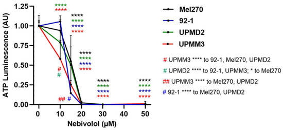 Additionally, the viability of the respective cell lines in response to nebivolol treatment was tested to determine whether the different sensitivity and responsiveness of the spheroids was due to the different 3D morphologies or whether cell-type dependent factors, such as genetics and proliferation rate, were involved (Figure 6). ATP was reduced concentration-dependently in all cell lines in the concentration range of 5–15 µM nebivolol in a comparable manner (Figure 6). However, the 92-1 cell line turned out to be most responsive to nebivolol when compared to the other cell lines (Figure 6). Thus, the responsiveness of cell lines was in line with their respective tumor spheroids (Figure 2), indicating that cell immanent factors were involved. However, the cell lines seemed to be more responsive than the 3D tumor spheroids (Figure 2).