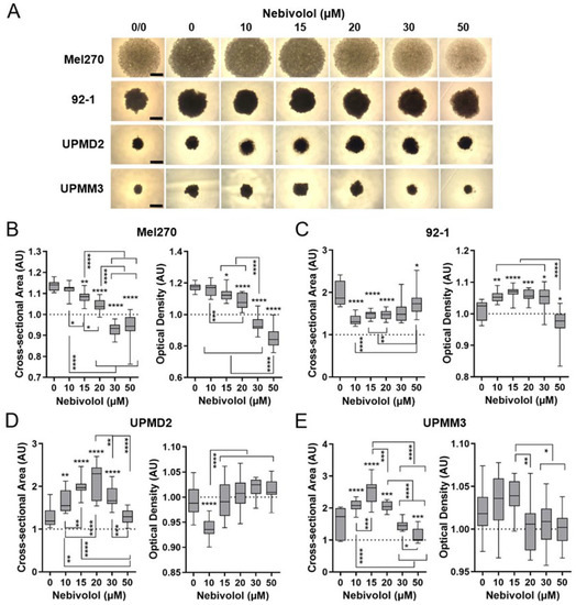 We next assessed the effects of nebivolol on the morphology of spheroid types and hence analyzed spheroid size and density of treated spheroids by microscopy (Figure 3). Drug concentrations ≥15 µM caused a significant decrease in the Mel270 spheroid area and density, indicating inhibition of spheroid growth and compactness (Figure 3A,B). Cell line 92-1 derived spheroids, however, only required drug concentrations of ≥10 µM for the reduction in size, while the density was increased, presumably caused by the shrinkage of the spheroids (Figure 3A,C). At a concentration of 50 µM nebivolol, the density significantly decreased, while the area increased again, indicating disintegration of 92-1 spheroids (Figure 3A,C). In contrast, the area of UPMD2 and UPMM3 spheroids increased at ≥10 µM and decreased again at ≥30 µM (UPMD2) and ≥20 µM (UPMM3), respectively (Figure 3A,D,E). The density of spheroids of the primary cell lines was only slightly affected by nebivolol (Figure 3A,D,E). The density of UPMD2 spheroids was reduced at 10 µM but increased again at ≥15 µM, most likely due to a restructuring of the density distribution (Figure 3A,D). However, microscopic observation of UPMM3 spheroids at 20 µM exhibited a blurred spheroid shape, indicating disintegration of the outer cell layers. The latter observation was reflected by a decrease in UPMM3 spheroid density at ≥20 µM indicating lower compactness (Figure 3A,E). Taken together, the morphology of all spheroid types was affected by nebivolol treatment at ≥10–15 µM, suggesting inhibition of spheroid cell growth and 3D structure by nebivolol treatment.