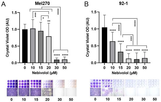 Long-term cytotoxicity of nebivolol-treated 3D tumor spheroid cells. At day 7, spheroids from cell lines (A) Mel270 or (B) 92-1 were treated with nebivolol at the indicated concentrations. Spheroid cultures were individually transferred to flat-bottom wells and cultured until control cells (0 µM nebivolol) were confluent. The long-term cytotoxic effect was determined in a spheroid cell survival assay. After 2 weeks in culture, the surviving cells were stained crystal violet (CV, OD 540 nm). Absorption of surviving cells was measured and normalized to the CV absorption of the control cells (0 µM nebivolol), given in arbitrary units (AU). Data are means ± SD of three independent experiments with n = 12 spheroids for each concentration. Statistical analysis was performed with one-way ANOVA and Tukey’s multiple comparisons test and significance levels are indicated at * p < 0.05, ** p < 0.01, *** p < 0.001, **** p < 0.0001. Representative images of CV staining of the spheroid-derived cell cultures (n = 12) and microscopic images of cells (10× magnification) for each concentration are shown below the graphs.