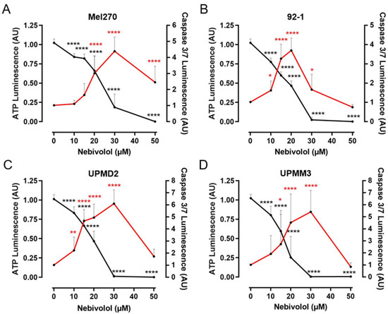 Early apoptotic effects and viability change of nebivolol in various 3D tumor spheroid models. Spheroids were generated from cell lines (A) Mel270 and (B) 92-1, or primary cell lines (C) UPMD2 and (D) UPMM3. Spheroids were treated once with nebivolol at the indicated concentration. Early apoptosis was assayed with a caspase 3/7 luminescence assay after incubation with nebivolol for 48 h (red line). Corresponding viability was assayed with an ATP luminescence assay (black line). The luminescence of the treated spheroids was normalized to the luminescence of the control spheroids (0 µM nebivolol) and is given in arbitrary units (AU). The means ± SD of three independent experiments for each UM tumor spheroid type with n = 6 spheroids for each condition are shown. Statistical analysis was conducted using one-way ANOVA and Tukey’s multiple comparisons test; the significance levels of the treated spheroids in relation to the control spheroids (0 µM nebivolol) are displayed. Significance levels are indicated at * p < 0.05, ** p < 0.01, **** p < 0.0001.