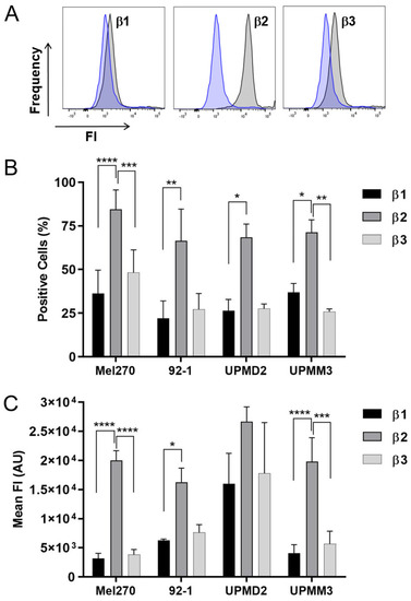 Next, it was examined whether the nebivolol sensitivity of UM cells was related to varying ß-adrenergic receptor levels (Figure 7). Therefore, we analyzed the presence of ß1, ß2, and ß3-adrenergic receptors on cell surfaces by flow cytometry (Figure 7A). The ß-adrenergic receptors were expressed in all cell lines and approximately 70–90% of UM cell populations were positive for β2 receptors, while 25–50% of cells were positive for ß1 or ß3 adrenergic receptors. Among the cell lines, Mel270 presented the highest percentage of positive cells (Figure 7B). Analysis of the mean fluorescence intensity of the stained cells revealed that the β2-adrenergic receptor was most strongly expressed in all cell lines (Figure 7C). However, UPMD2 cells showed large variations in β-adrenergic receptor expression levels. Conclusively, the data suggest that the β2-adrenergic receptor is most prominently expressed on the cell surface of UM cells.
