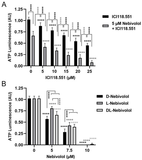 Effects of β2-adrenoceptor antagonism and of nebivolol enantiomers on ATP levels of Mel270 cells. (A) Cells were treated once with β2-antagonist ICI 118.551 at the indicated concentrations in the absence or presence of 5 µM nebivolol. (B) Cells were treated once with either D-nebivolol, L-nebivolol, or racemic DL-nebivolol at the indicated concentrations. After 7 days of incubation, cell ATP was assayed with an ATP luminescence assay. ATP luminescence of treated spheroids was normalized to ATP luminescence of controls (0 µM) and is given in arbitrary units (AU). The means ± SD of three independent experiments with n = 6 cultures each condition shown. Statistical analysis by two-way ANOVA and Tukey’s multiple comparisons test, significance levels were indicated **** p < 0.0001.