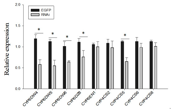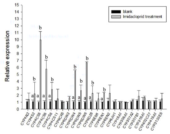 3.3. Differential Expression of BtP450 Genes under Imidacloprid Treatment